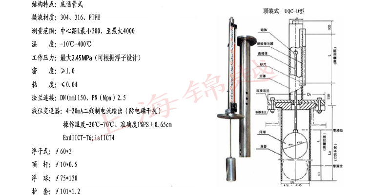 UQC系列磁性浮球液位計,可適用于各種開口或密閉容器內的液位測量,特別對高壓、高溫、高粘度、強腐蝕性介質更顯其******性。由于被測介質與指示器******隔離,所以它比傳統(tǒng)的板式、管式液位計具有更高的可靠性、安全性和實用性。該儀表與他的輔助儀表LB型磁型位置變送器,AK型磁性報警開關組合應用,可連續(xù)輸出4~20mA模擬信號及開關量信號,可實現液位的上,下限遠距離的控制及報警。該儀表也可以同其他的數顯儀配套使用,達到多種控制目的。它廣泛用于電力、石油、化工、環(huán)保、船舶、建筑、食品等各行業(yè)生產過程中的液位測量與控制。